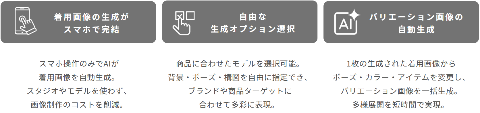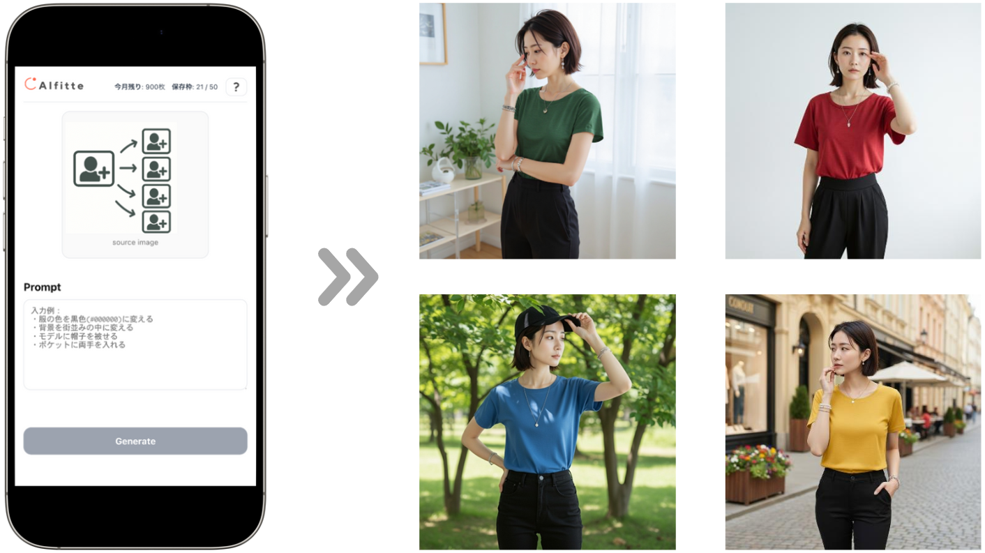 一度生成した画像をベースに、人物イメージ変更/カラー変更/ポーズ変更/アイテム追加削除などのバリエーション画像を自動生成でき、ブランドに合わせて展開できます。